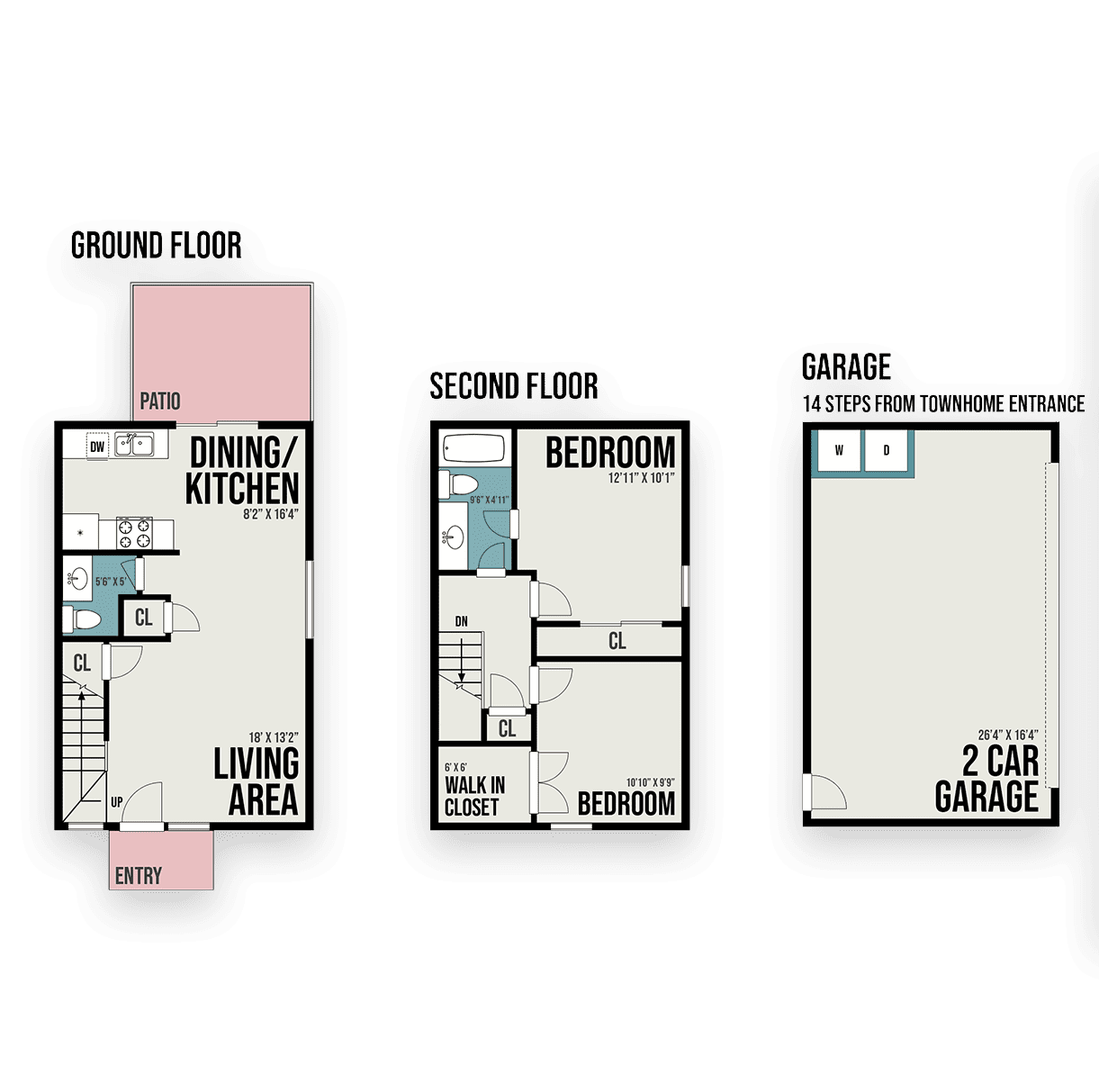 This two-story layout offers 2 bedrooms and 1.5 baths with a private patio and full-size washer and dryer connections. The living and dining areas are designed for everyday comfort, with a two-car garage adding extra convenience.