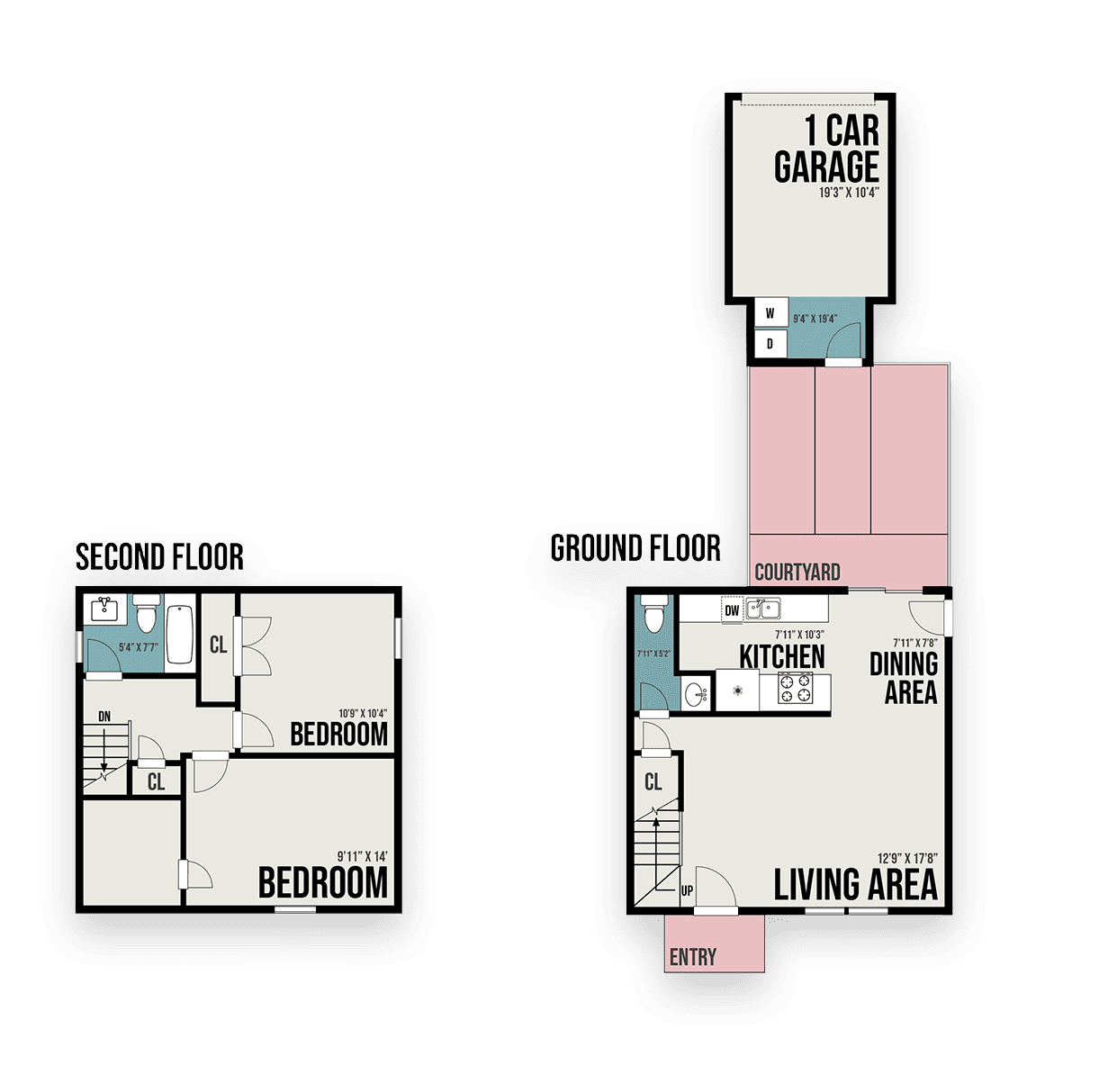 This two-story layout offers 2 bedrooms and 1.5 baths with a private courtyard and full-size washer and dryer connections. The living and dining areas are designed for everyday comfort, with a one-car garage adding convenience.
