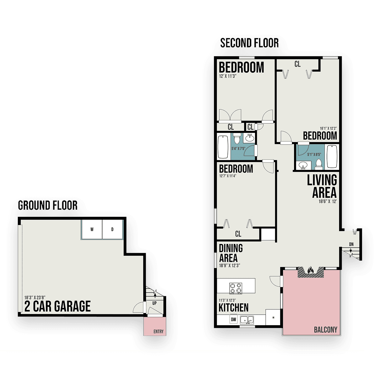 This ground-floor layout offers 3 bedrooms and 2 baths with a private patio and full-size washer and dryer connections. The living and dining areas are designed for everyday comfort, with a one-car garage adding convenience.